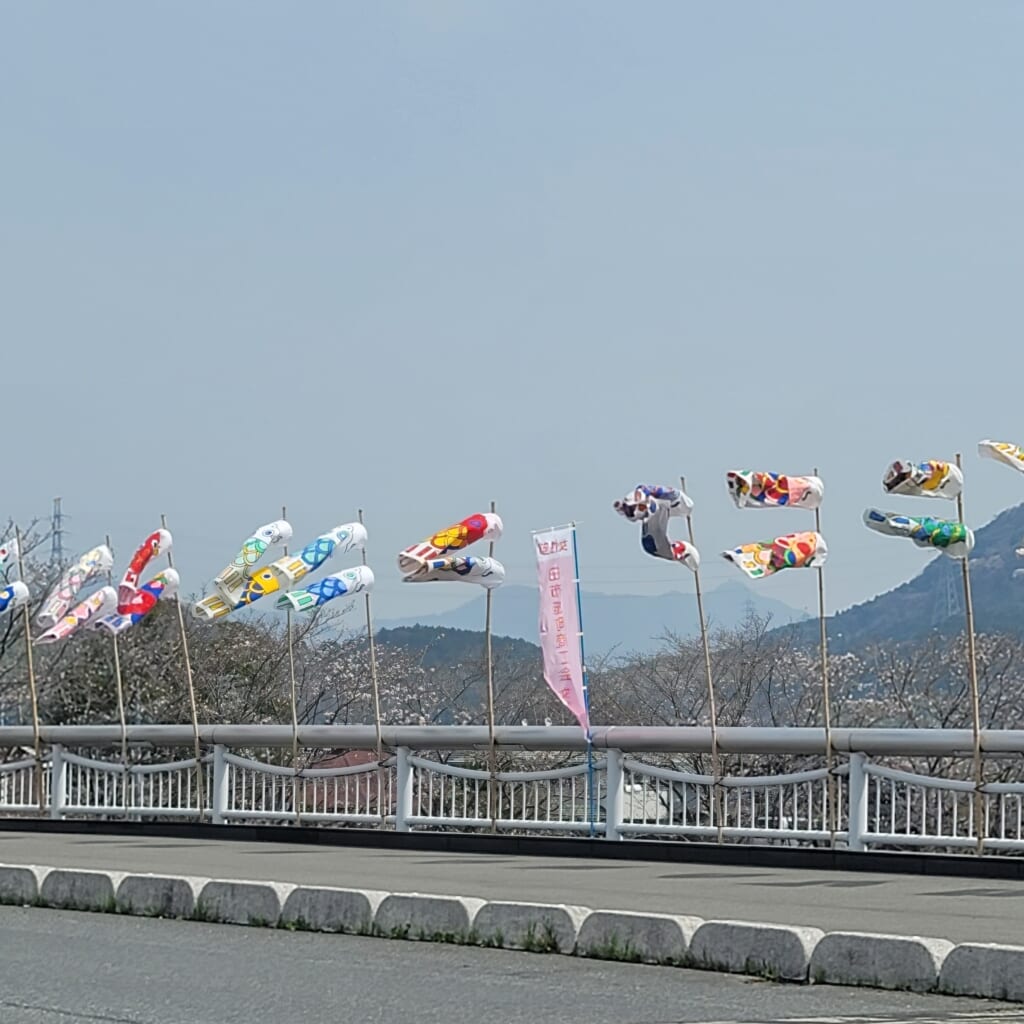 橋には両サイドにこいのぼり。気持ちよさそうに泳いでいます。