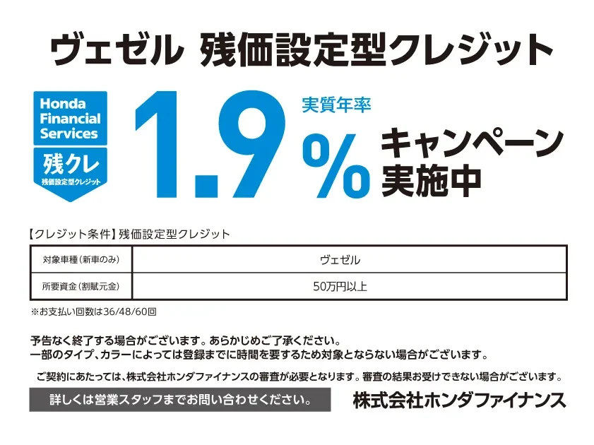 2025.10.03 ヴェゼル 残価設定型クレジット キャンペーン金利実施中! #ご購入プラン ヴェゼルが、残価設定型クレジット実質年率1.9%キャンペーン中でお買い時です。詳しくは営業スタッフまでお問い合わせください。